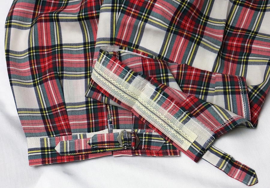 | ウエストの 持ち出し部分 | 従来のボタン止めのタイプとフック金具二つ付けタイプ。(ボタンホールが無いのでスッキリ見えます) |